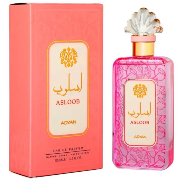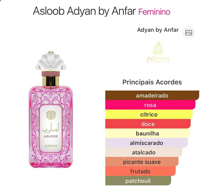 Asloob, da Adyan by Anfar, é uma fragrância feminina oriental floral lançada em 2021, conhecida por seu aroma sofisticado, doce e ótima fixação. Com notas de pêra, bergamota, rosa, jasmim, baunilha e almíscar branco, é descrito como um perfume moderno, fresco e ousado, ideal para o uso diário, comparado frequentemente ao Idôle de Lancôme