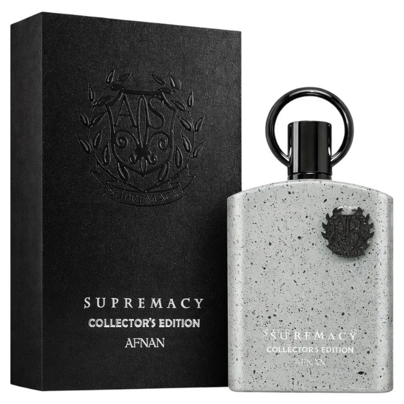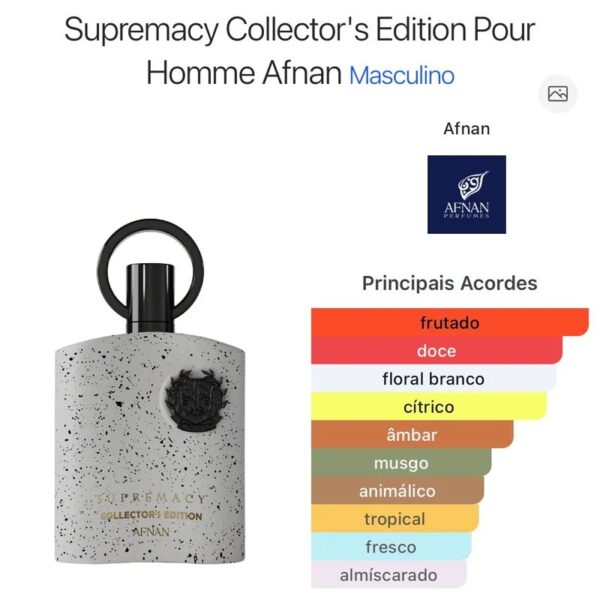 Supremacy Collector’s Edition Pour Homme de Afnan é um perfume Chipre Frutado Masculino. Esta é uma nova fragrância. Supremacy Collector’s Edition Pour Homme foi lançado em 2024. O perfumista que assina esta fragrância é Imran Fazlani. As notas de topo são: Abacaxi, Bergamota, Flores Brancas e Maçã. As notas de coração são: Flor de Laranjeira, Bétula e Âmbar. As notas de fundo são: Musgo de Carvalho, Almíscar e Âmbar Cinzento.