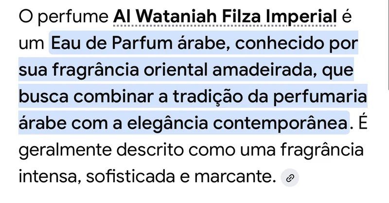 Filza Imperial de Al Wataniah é uma fragrância unissex (frequentemente descrita como masculina) Eau de Parfum de 100ml, famosa por seu aroma oriental amadeirado. Lançado como um perfume marcante e luxuoso, oferece uma mistura de notas cítricas, florais e quentes, com ótima fixação de 8 a 10 horas.