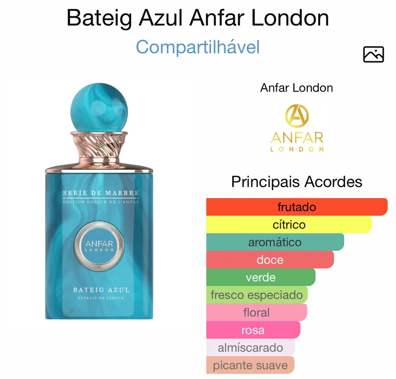 Produzido pela renomada Anfar Perfumes, referência na perfumaria árabe, o Bateig Azul London destaca-se pelo uso de matérias-primas nobres e pela alta concentração aromática, refletindo sofisticação e exclusividade.