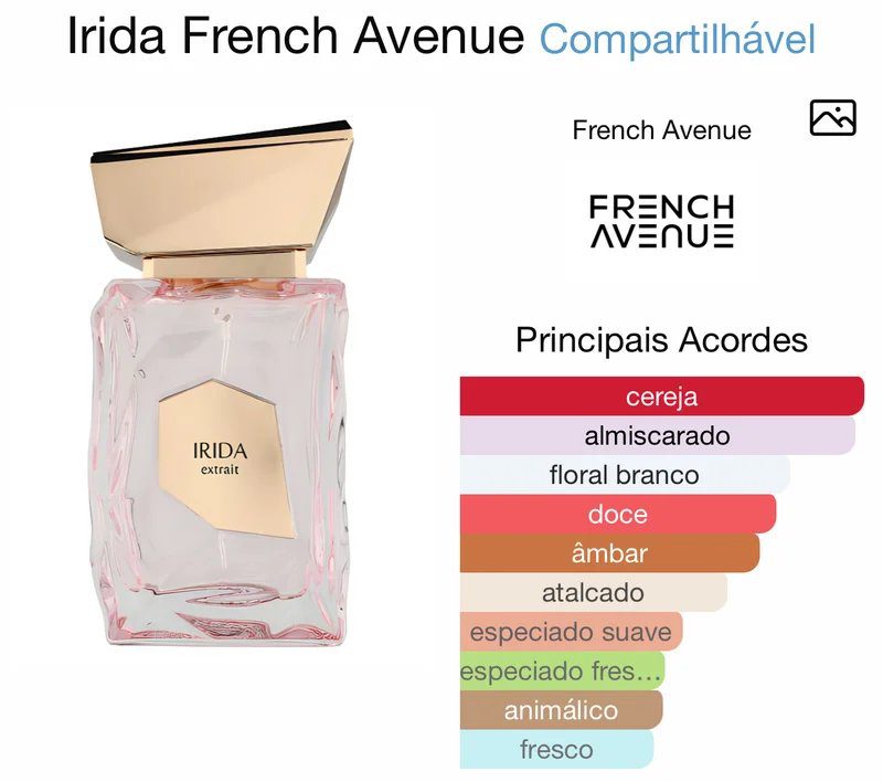 Irida de French Avenue é um perfume Compartilhável. Irida foi lançado em 2024. As notas de topo são: Cereja e Gengibre. A nota de coração é: Jasmim. As notas de fundo são: Almíscar, Pimenta Rosa e Âmbar.