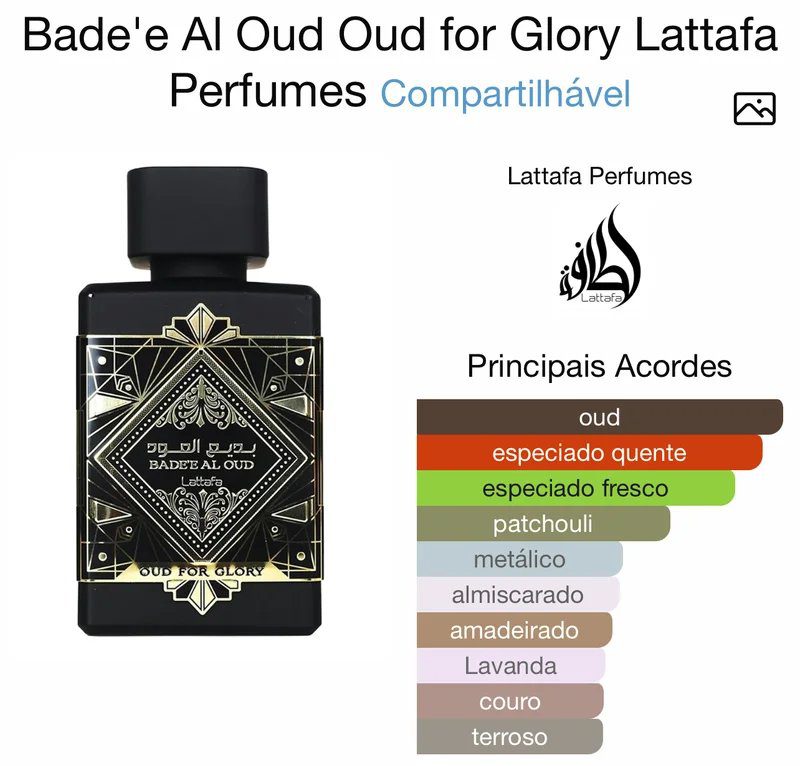 Com notas excepcionais e madeiras preciosas, Bade’e Al Oud Oud for Glory Lattafa Eau de Parfum revela um perfume rico, sensual e refinado.