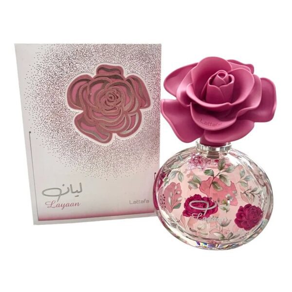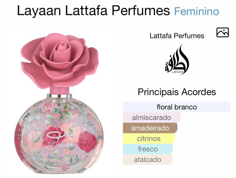 Layaan de Lattafa Perfumes é um perfume Floral Frutado Feminino. Esta é uma nova fragrância. Layaan foi lançado em 2025. As notas de topo são: Pera Verde e Mandarina. As notas de coração são: Jasmim, Lírio-do-Vale e Gardênia. As notas de fundo são: Almíscar e Cedro.