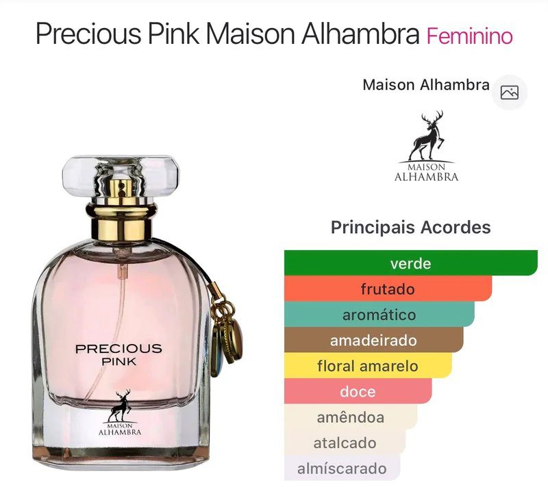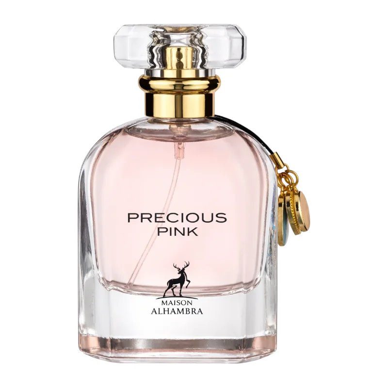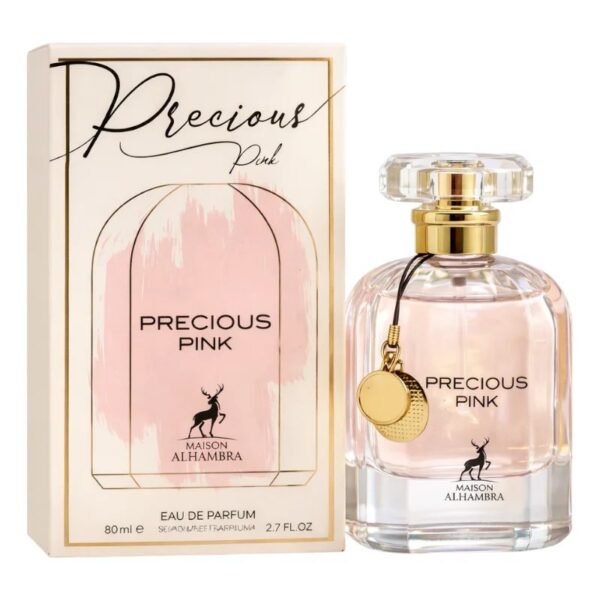 Precious Pink de Maison Alhambra é um perfume Oriental Floral Feminino. Precious Pink foi lançado em 2022. As notas de topo são: Ruibarbo e Narciso. A nota de coração é: Leite de amêndoas. As notas de fundo são: Cashmeran e Cedro.