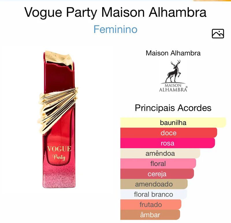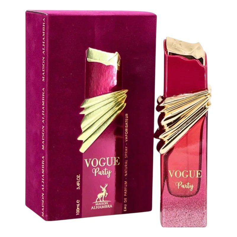 Vogue Party de Maison Alhambra é um perfume Oriental Floral Feminino. Esta é uma nova fragrância. Vogue Party foi lançado em 2024. As notas de topo são: Cereja e Amêndoa. As notas de coração são: Água de Rosas, Lírio e Ambreta. As notas de fundo são: Fava Tonka, Baunilha, Musgo de Carvalho e Vetiver.