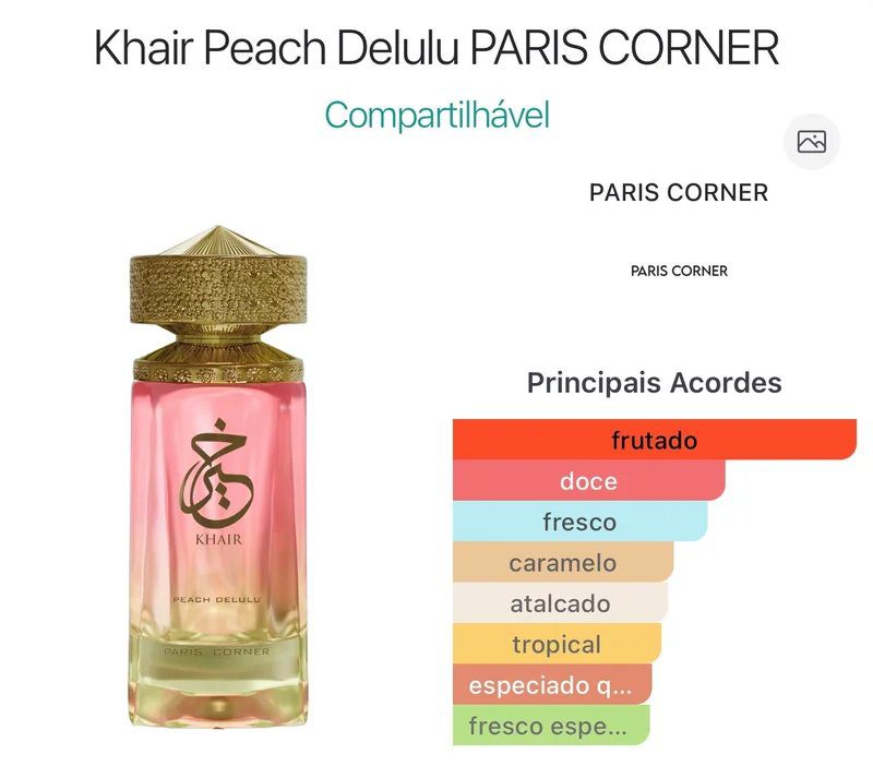 Khair Peach Delulu de PARIS CORNER é um perfume Oriental Baunilha Compartilhável. Esta é uma nova fragrância. Khair Peach Delulu foi lançado em 2025. As notas de topo são: Pêssego, Goiaba e Nectarina. As notas de coração são: Gengibre e Cardamomo. As notas de fundo são: Caramelo, Almíscar e Madeira Seca.