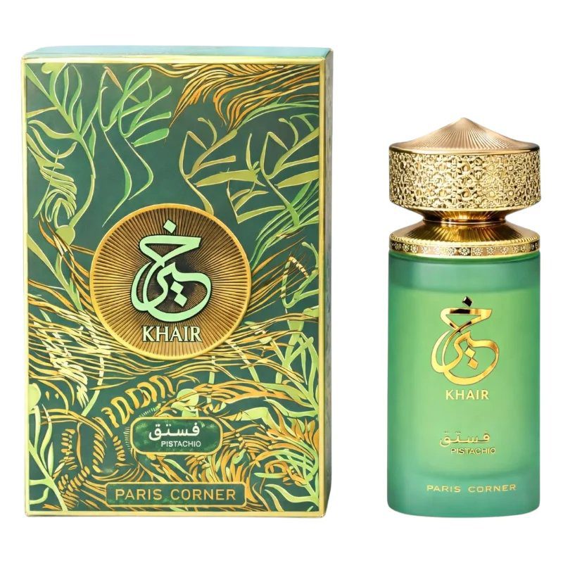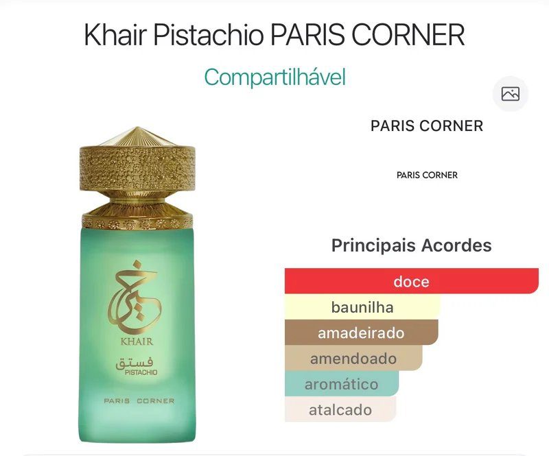 Khair Pistachio de PARIS CORNER é um perfume Floral Frutado Gourmet Compartilhável. Khair Pistachio foi lançado em 2023. As notas de topo são: Pistache, Sorvete, Bergamota, Avelã, Cardamomo e Rum. As notas de coração são: Pera, Jasmim, Peônia, Gerânio, Framboesa e Pêssego Branco. As notas de fundo são: Chantilly, Marshmellow, Algodão-Doce, Fava Tonka e Cedro.