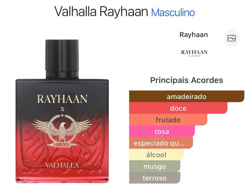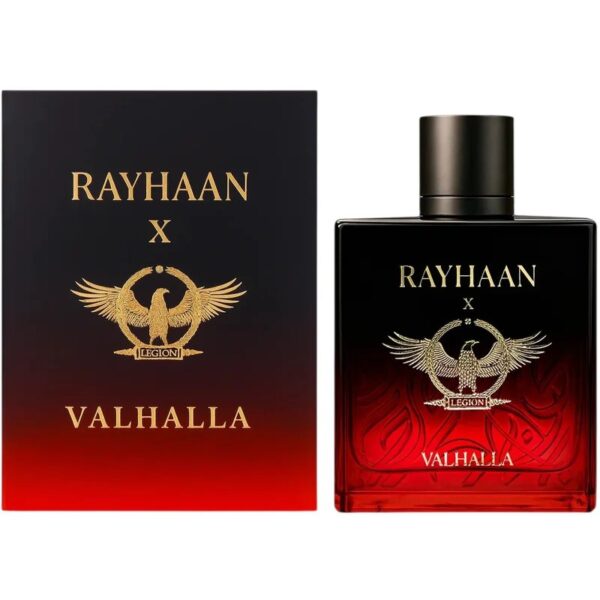 Valhalla de Rayhaan é um perfume Aromático Frutado Masculino. Esta é uma nova fragrância. Valhalla foi lançado em 2025. As notas de topo são: Framboesa, Conhaque e Licor. As notas de coração são: Fava Tonka, Rosa Búlgara e Musgo de Carvalho. As notas de fundo são: Sândalo, Carvalho e Pralinê.