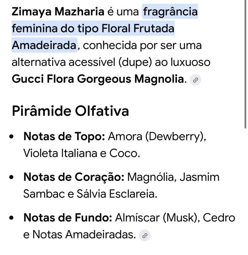 O Zimaya Mazharia é um perfume feminino Eau de Parfum de 100ml, conhecido por ser uma fragrância floral frutada amadeirada elegante, moderna e sedutora. Com ótima fixação (6 a 8 horas) e projeção moderada, é ideal para o uso diário ou eventos especiais, trazendo notas de amora, violeta, coco, magnólia e cedro.